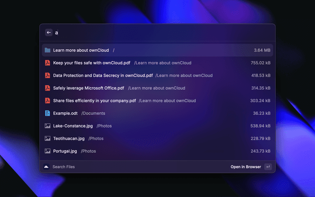 This is a Raycast extension for ownCloud. It allows you to search for files and folders in your ownCloud instance directly from Raycast.