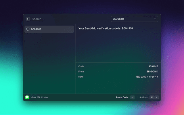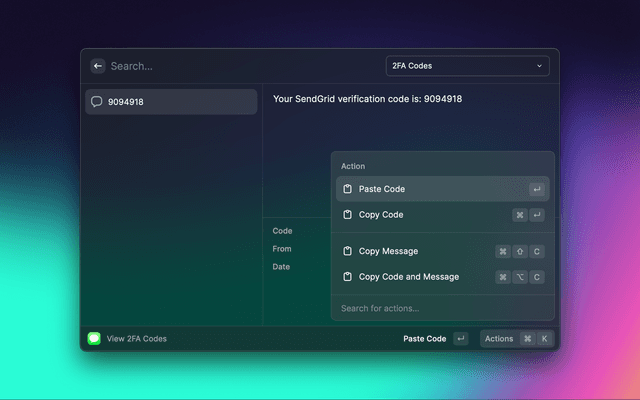 View 2FA codes from iMessage and Email (Apple Mail or Gmail) in Raycast.